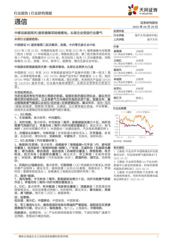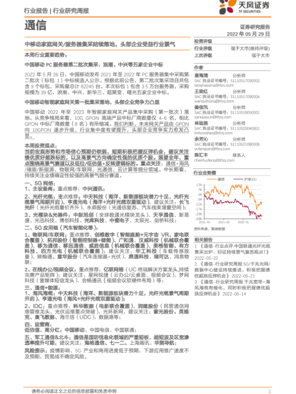 【天风证券】【20220529】通信行业研究周报:中移动家庭网关 服务器集采陆续落地,头部企业受益行业景气-11页