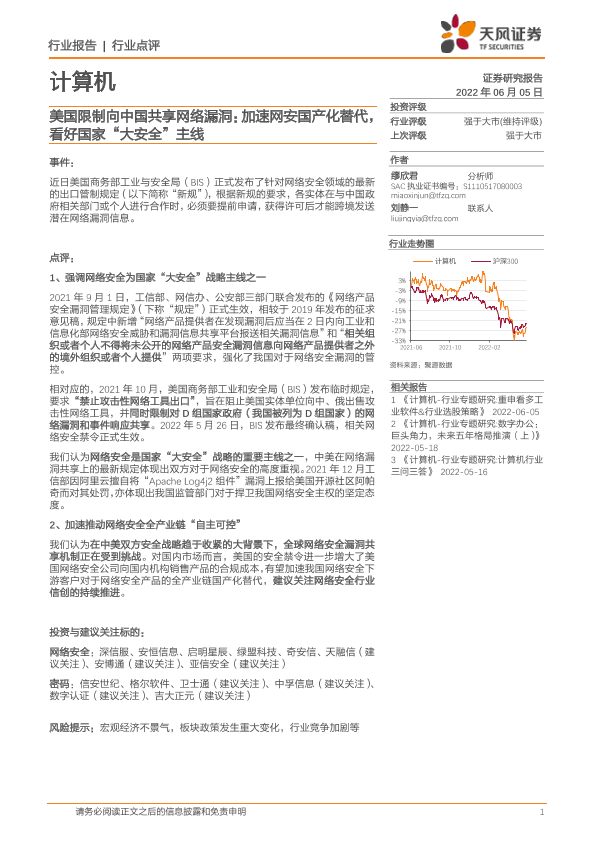 【天风证券】【20220605】美国限制向中国共享网络漏洞:加速网安国产化替代,看好国家“大安全”主线-2页
