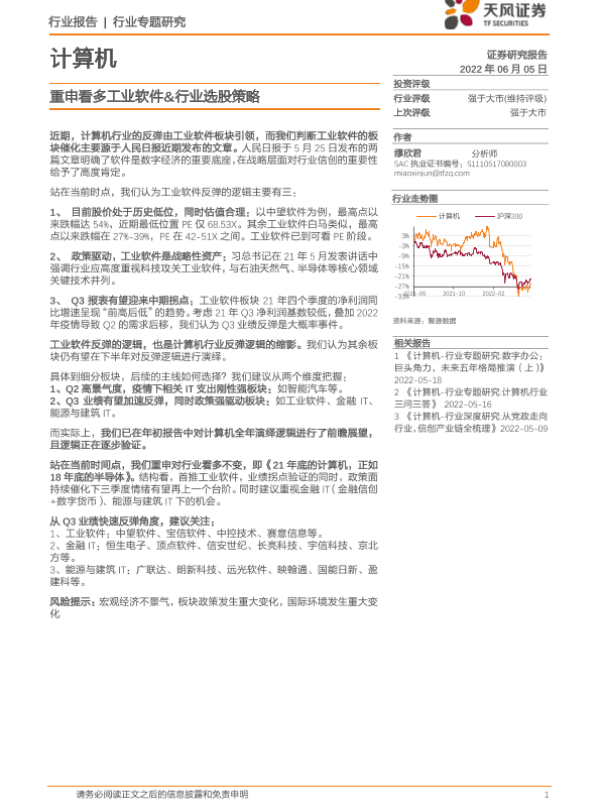 【天风证券】【20220605】计算机行业专题研究:重申看多工业软件&行业选股策略-7页