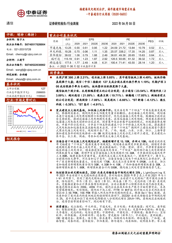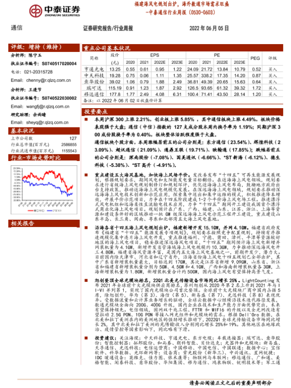 【中泰证券】【20220605】20220605-中泰证券-中泰通信行业周报:福建海风电规划出炉,海外数通市场需求旺盛-14页