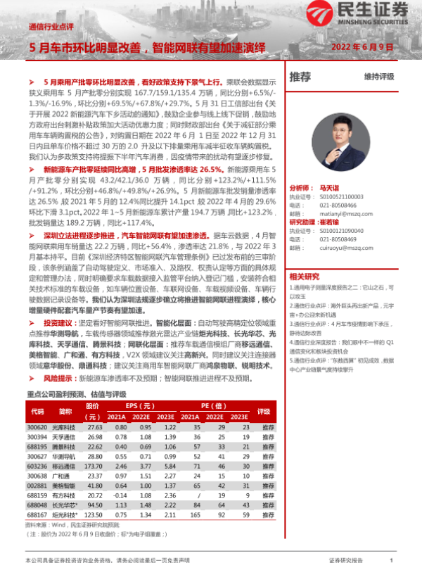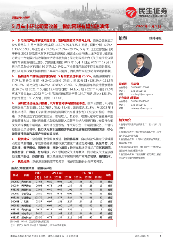 【民生证券】【20220609】通信行业点评:5月车市环比明显改善,智能网联有望加速演绎-2页