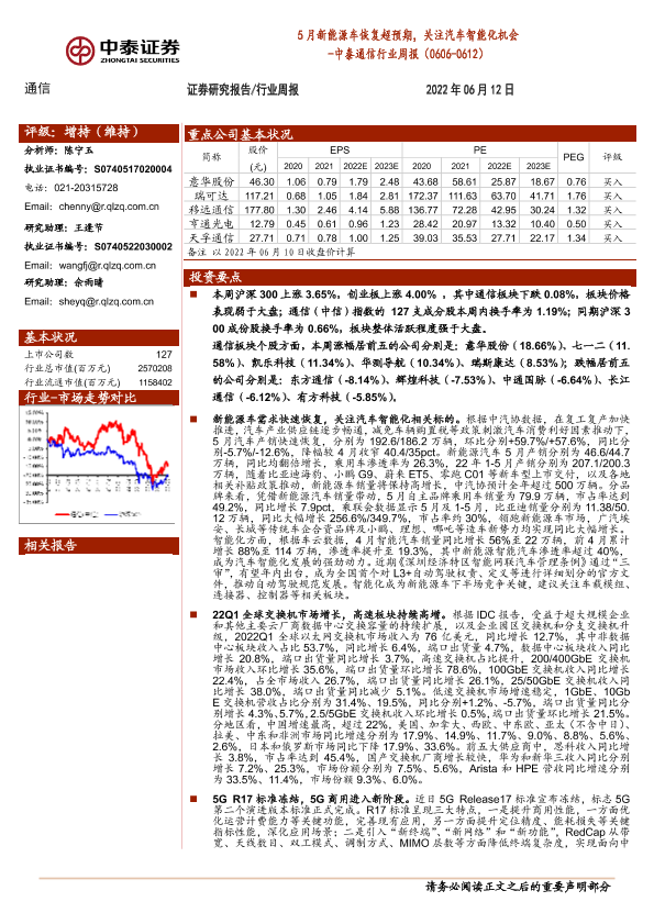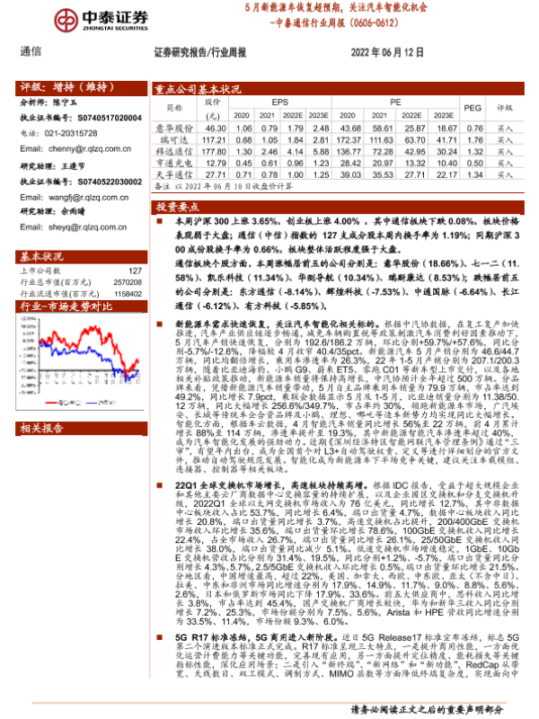 【中泰证券】【20220612】5月新能源车恢复超预期,关注汽车智能化机会-17页