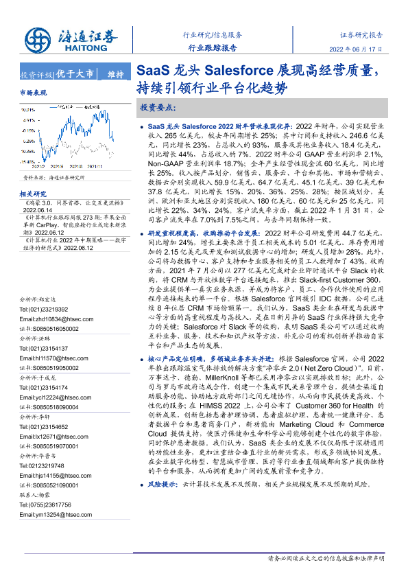 【海通证券】【20220617】信息服务行业跟踪报告:SaaS龙头Salesforce展现高经营质量,持续引领行业平台化趋势-2页