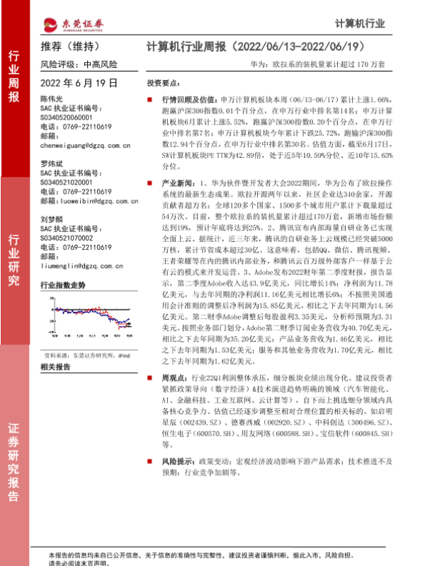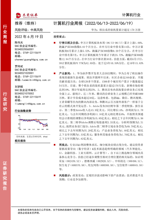 【东莞证券】【20220619】计算机行业周报:华为:欧拉系的装机量累计超过170万套-8页