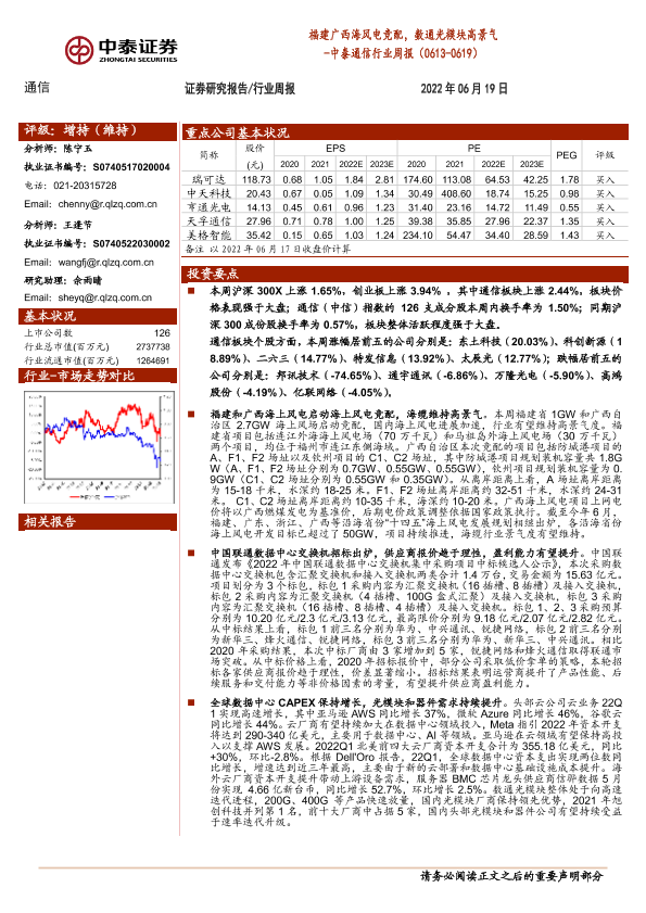 【中泰证券】【20220619】福建广西海风电竞配,数通光模块高景气 -中泰通信行业周报(0613-0619)-13页