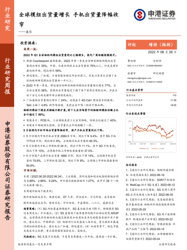 【申港证券】【20220626】20220626-申港证券-通信行业研究周报:全球模组出货量增长 手机出货量降幅收窄-11页
