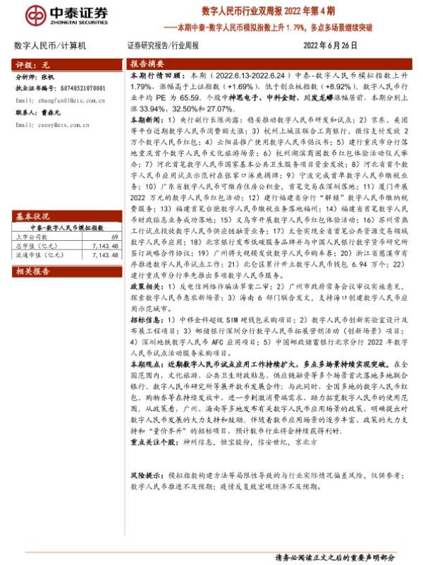 【中泰证券】【20220626】20220626-中泰证券-计算机数字人民币行业双周报2022年第4期:本期中泰-数字人民币模拟指数上升1.79%,多点多场景继续突破-13页