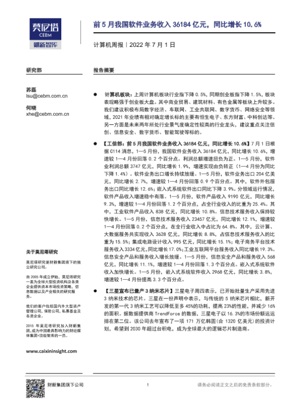 【莫尼塔研究】【20220701】20220701-莫尼塔投资-计算机周报:前5月我国软件业务收入36184亿元,同比增长10.6%-6页