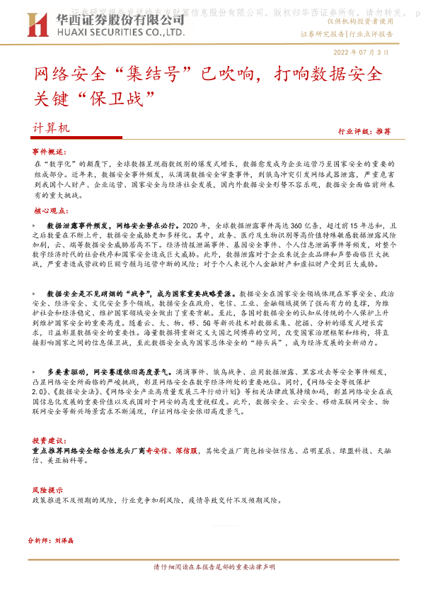 【华西证券】【20220703】网络安全“集结号”已吹响,打响数据安全关键“保卫战”-4页