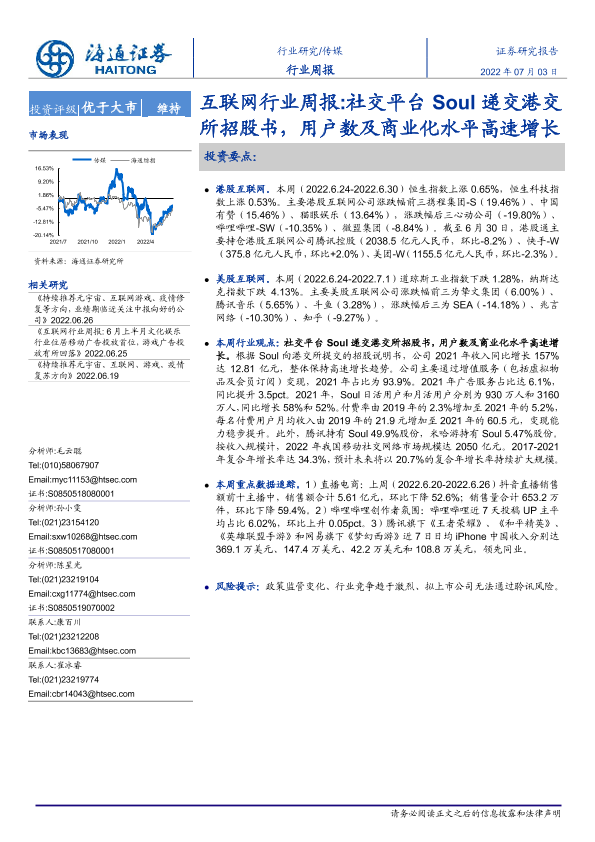 【海通证券】【20220703】互联网行业周报:社交平台Soul递交港交所招股书,用户数及商业化水平高速增长-9页