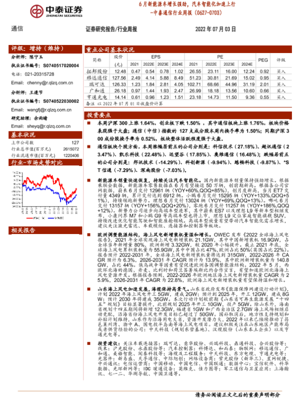 【中泰证券】【20220703】6月新能源车增长强劲,汽车智能化加速上行 -中泰通信行业周报(0627-0703)-13页