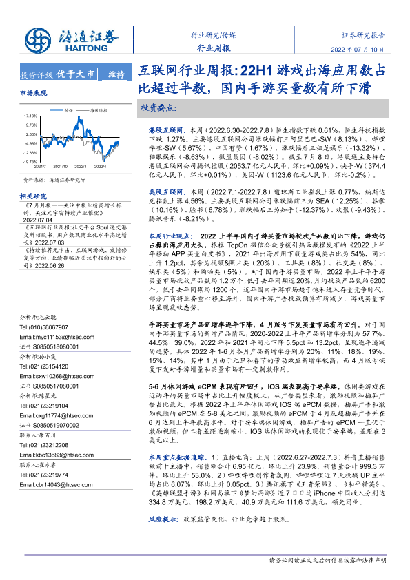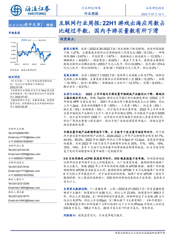 【海通证券】【20220710】20220710-海通证券-互联网行业周报:22H1游戏出海应用数占比超过半数,国内手游买量数有所下滑-9页