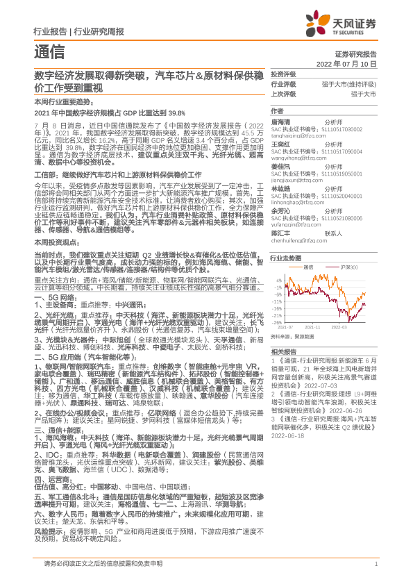 【天风证券】【20220710】20220710-天风证券-通信行业研究周报:数字经济发展取得新突破,汽车芯片&原材料保供稳价工作受到重视-13页