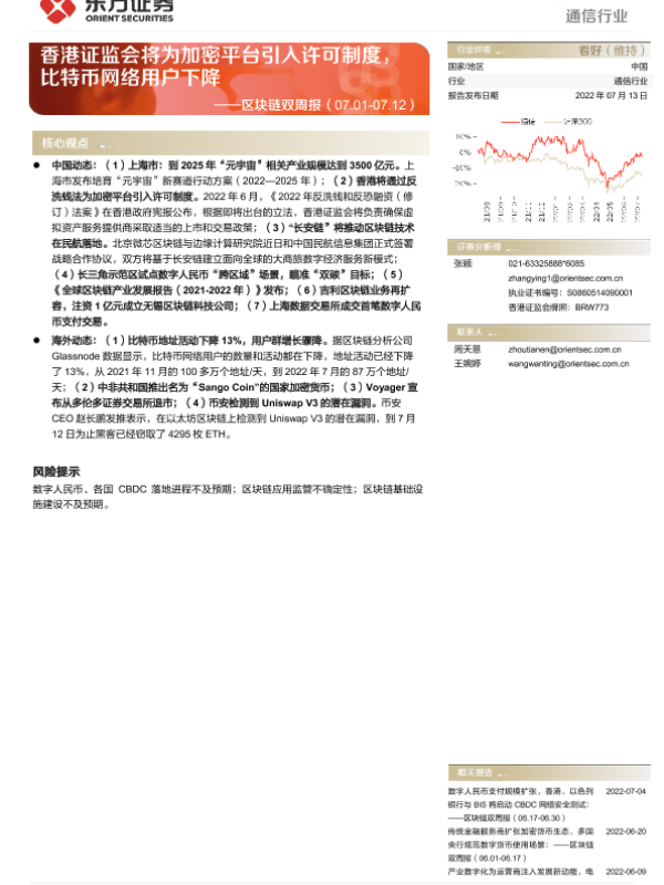 【东方证券】【20220713】通信行业区块链双周报:香港证监会将为加密平台引入许可制度,比特币网络用户下降-10页