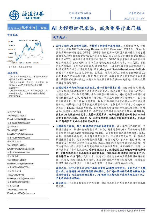 【海通证券】【20220713】信息服务行业跟踪报告:AI大模型时代来临,成为重要行业门槛-2页