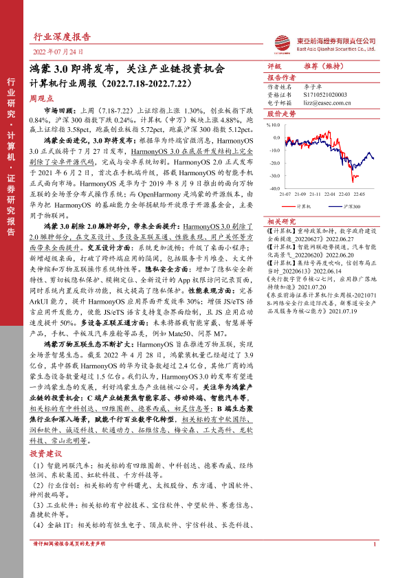 【东亚前海证券】【20220724】20220724-东亚前海证券-计算机行业周报:鸿蒙3.0即将发布,关注产业链投资机会-15页