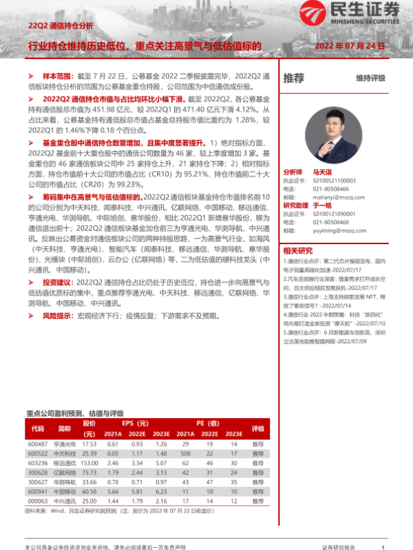 【民生证券】【20220724】22Q2通信行业持仓分析:行业持仓维持历史低位,重点关注高景气与低估值标的-9页