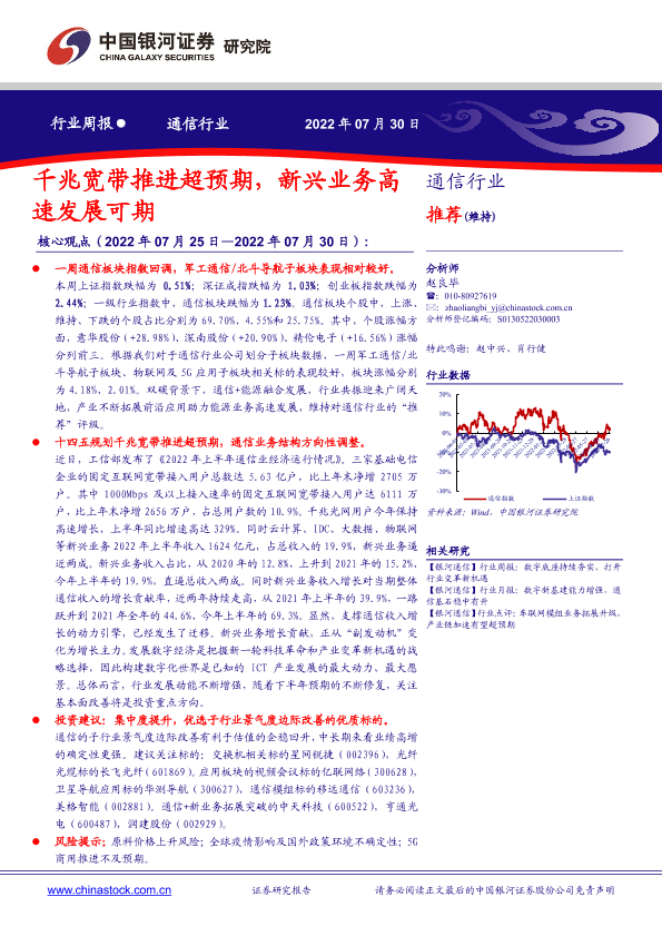 【银河证券】【20220730】20220730-中国银河-通信行业周报:千兆宽带推进超预期,新兴业务高速发展可期-17页