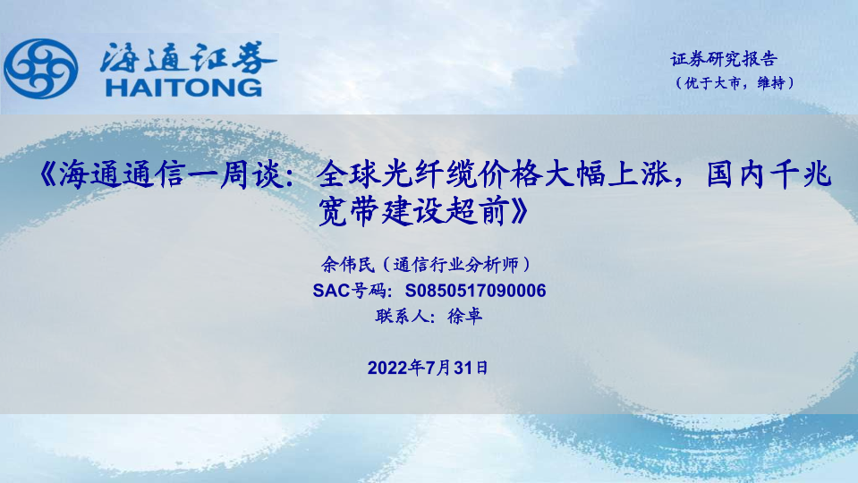 【海通证券】【20220731】海通通信一周谈:全球光纤缆价格大幅上涨,国内千兆宽带建设超前-13页