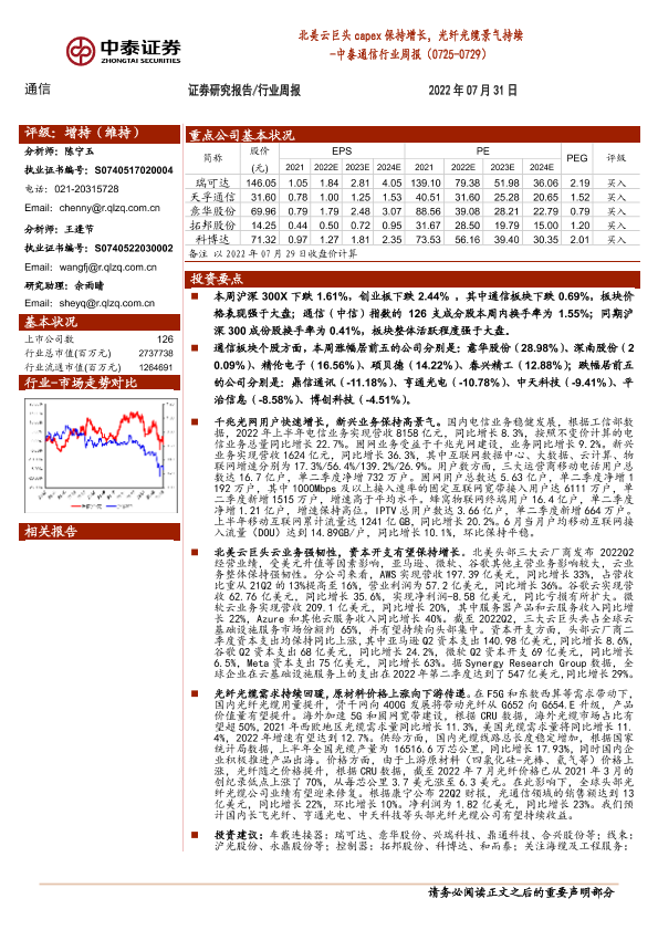 【中泰证券】【20220731】中泰通信行业周报:北美云巨头capex保持增长,光纤光缆景气持续-18页