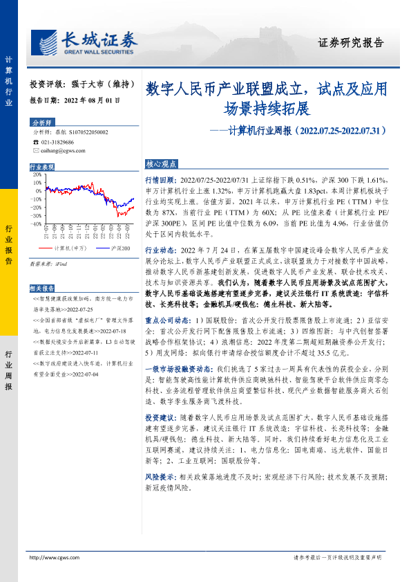 【长城证券】【20220801】20220801-长城证券-计算机行业周报:数字人民币产业联盟成立,试点及应用场景持续拓展-11页