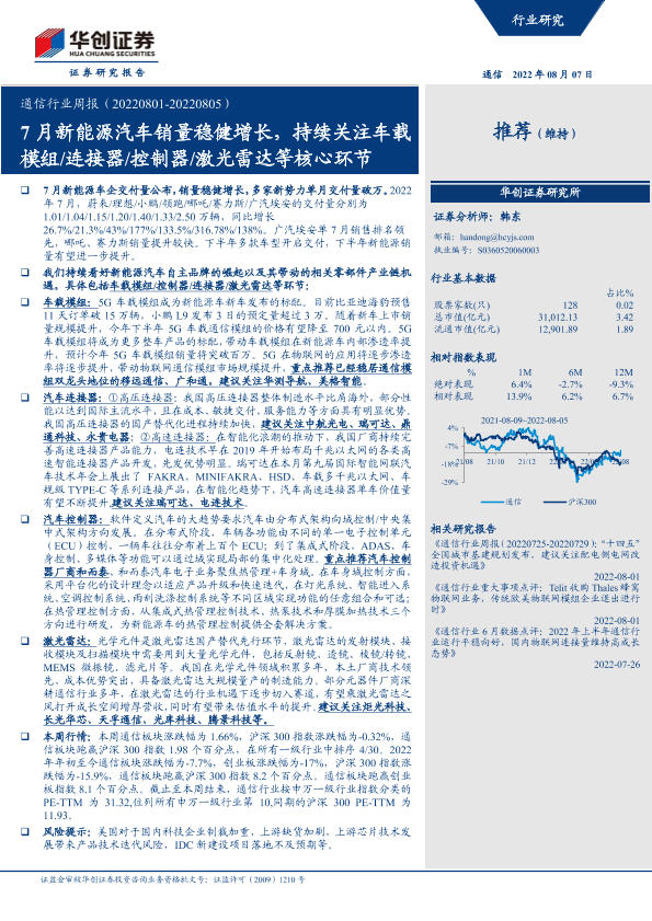 【华创证券】【20220807】通信行业周报:7月新能源汽车销量稳健增长,持续关注车载模组 连接器 控制器 激光雷达等核心环节-18页