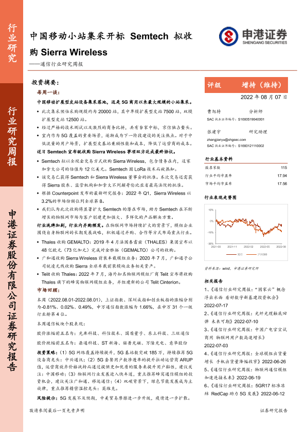 【申港证券】【20220807】20220807-申港证券-通信行业研究周报:中国移动小站集采开标 Semtech拟收购Sierra Wireless-14页