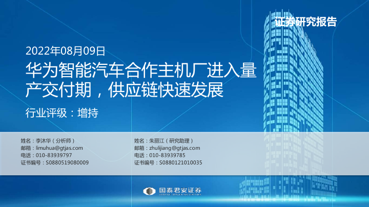 【国泰君安证券】【20220809】华为智能汽车合作主机厂进入量产交付期,供应链快速发展-86页