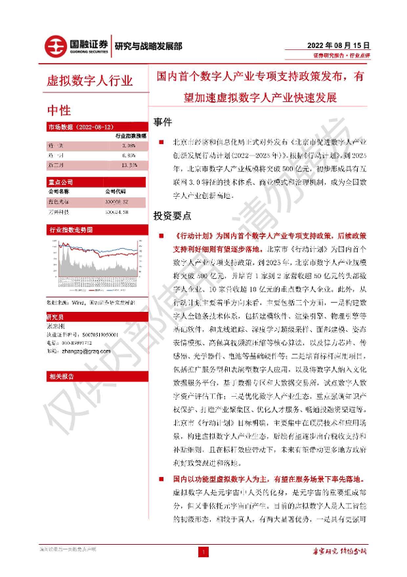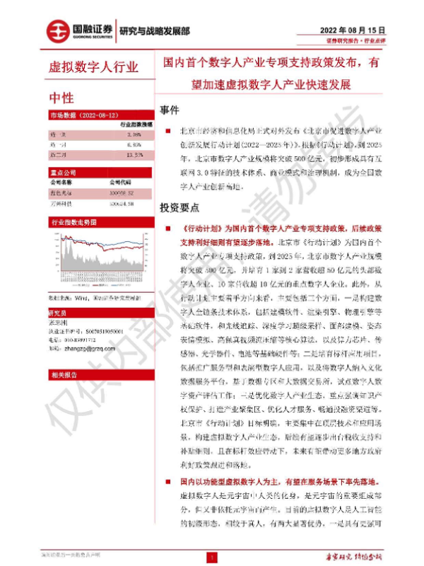【国融证券】【20220815】虚拟数字人行业:国内首个数字人产业专项支持政策发布,有望加速虚拟数字人产业快速发展-3页