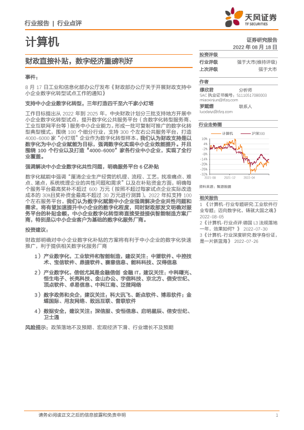 【天风证券】【20220818】计算机:财政直接补贴,数字经济重磅利好-2页