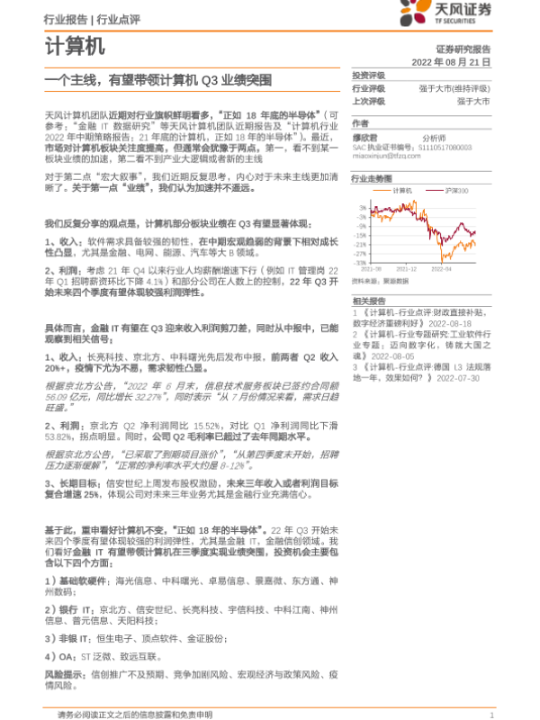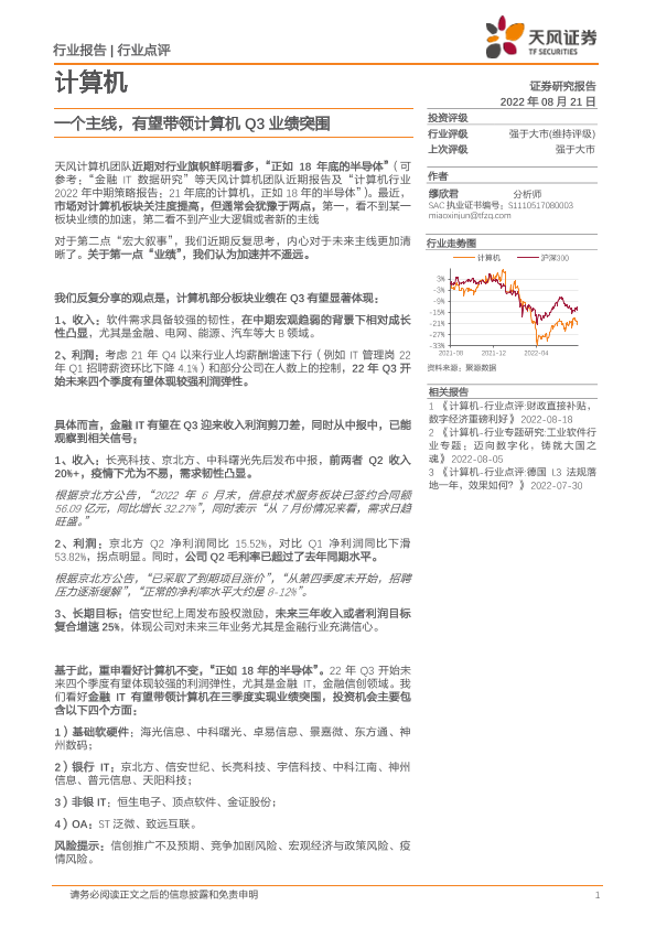 【天风证券】【20220821】20220821-天风证券-计算机行业点评:一个主线,有望带领计算机Q3业绩突围-2页