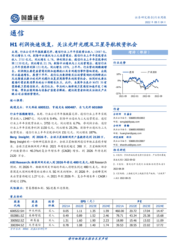 【国盛证券】【20220904】20220904-国盛证券-通信行业周报:H1利润快速恢复,关注光纤光缆及卫星导航投资机会-17页