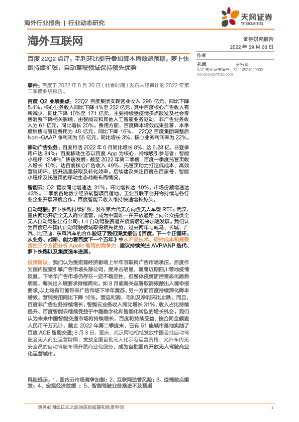【天风证券】【20220908】百度22Q2点评:毛利环比提升叠加降本增效超预期,萝卜快跑持续扩张,自动驾驶领域保持领先优势-11页