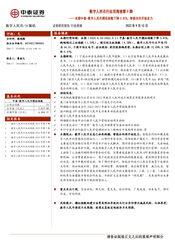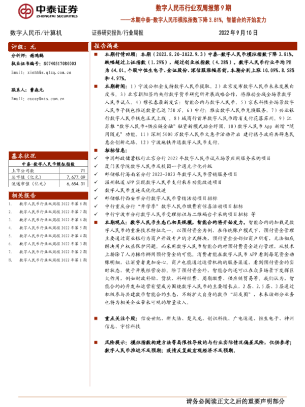 【中泰证券】【20220910】20220910-中泰证券-数字人民币行业双周报第9期:本期中泰-数字人民币模拟指数下降3.81%,智能合约开始发力-14页