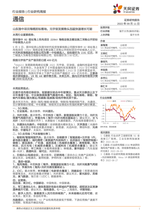 【天风证券】【20220911】通信行业研究周报:山东渤中项目海缆招标落地,元宇宙发展势头迅猛快速增长可期-11页