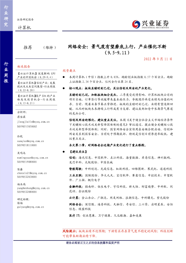 【兴业证券】【20220911】20220911-兴业证券-计算机行业周报:网络安全:景气度有望磨底上行,产业催化不断-24页
