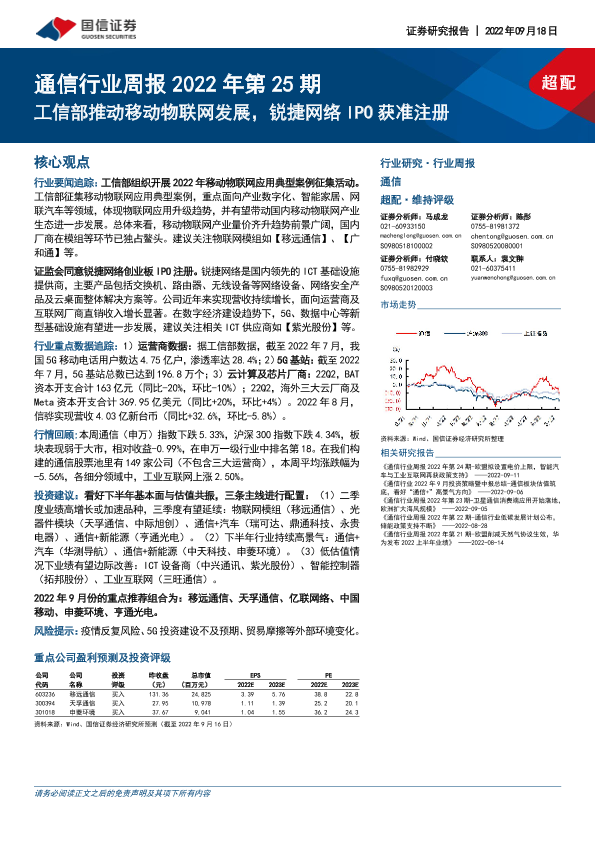 【国信证券】【20220918】通信行业周报2022年第25期:工信部推动移动物联网发展,锐捷网络IPO获准注册-29页