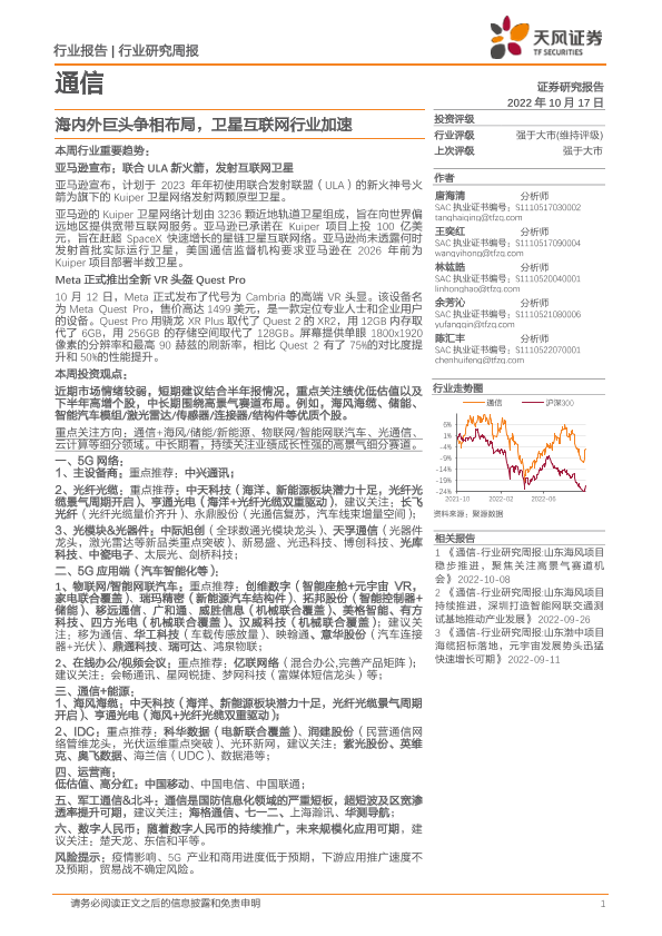【天风证券】【20221017】通信行业研究周报:海内外巨头争相布局,卫星互联网行业加速-11页