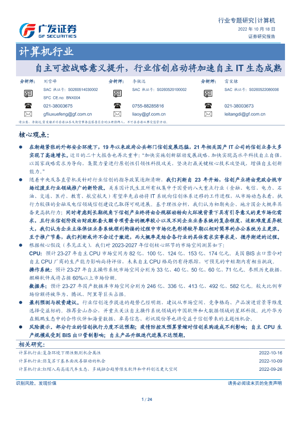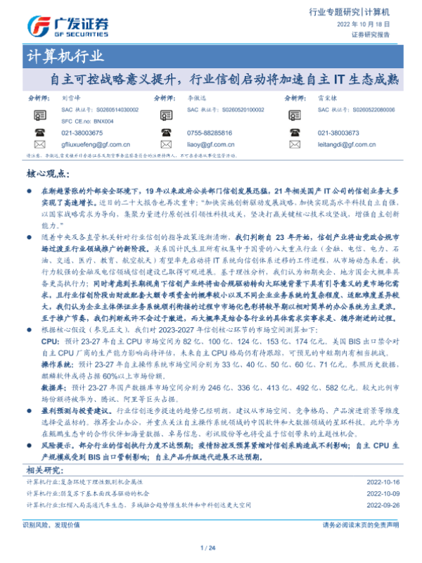 【广发证券】【20221018】计算机行业:自主可控战略意义提升,行业信创启动将加速自主IT生态成熟-24页