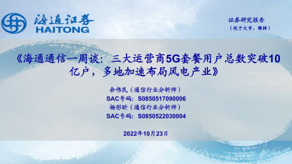 【海通证券】【20221023】海通通信一周谈:三大运营商5G套餐用户总数突破10亿户,多地加速布局风电产业-13页