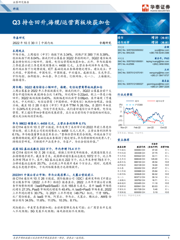 【华泰证券】【20221030】科技专题研究:Q3持仓回升,海缆/运营商板块获加仓-23页