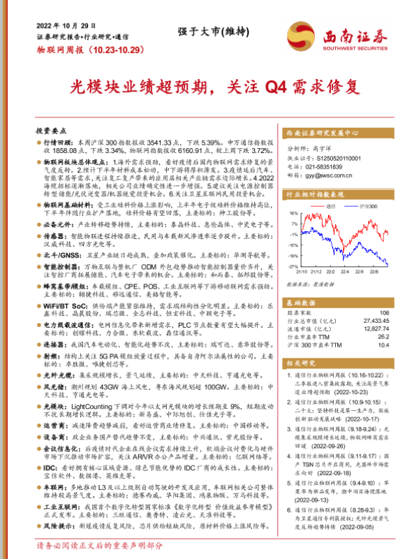 【西南证券】【20221029】20221029-西南证券-物联网周报:光模块业绩超预期,关注Q4需求修复-31页