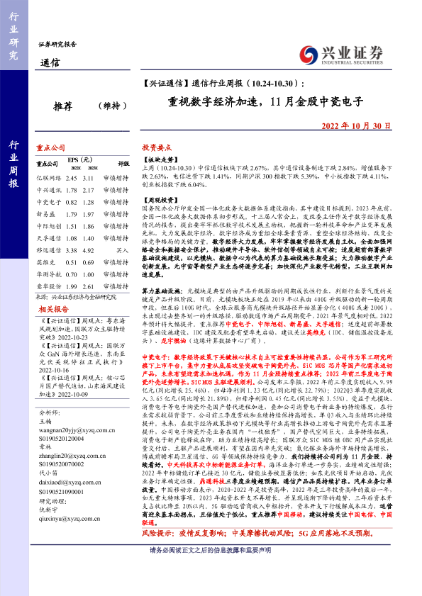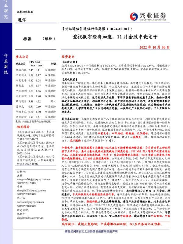 【兴业证券】【20221030】通信行业周报(10.24-10.30):重视数字经济加速,11月金股中瓷电子-15页
