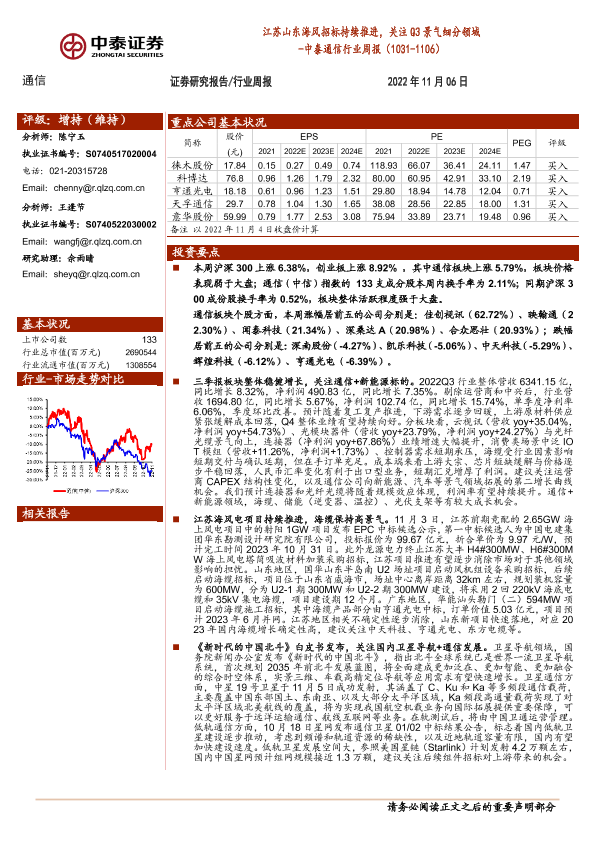 【中泰证券】【20221106】20221106-中泰证券-中泰通信行业周报:江苏山东海风招标持续推进,关注Q3景气细分领域-25页