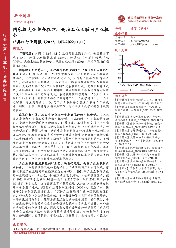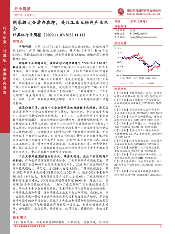 【东亚前海证券】【20221113】20221113-东亚前海证券-计算机行业周报:国家级大会举办在即,关注工业互联网产业机会-16页