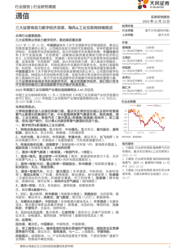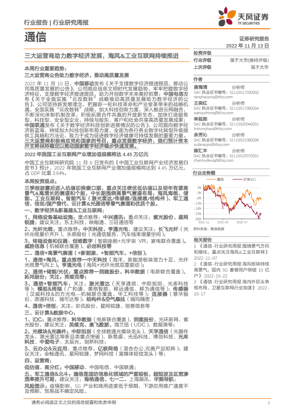 【天风证券】【20221113】通信行业研究周报:三大运营商助力数字经济发展,海风&工业互联网持续推进-12页