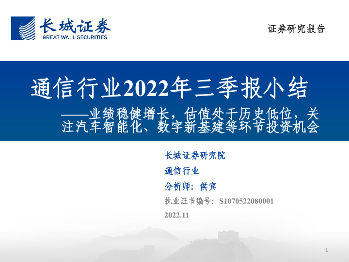 【长城证券】【202211】通信行业2022年三季报小结:业绩稳健增长,估值处于历史低位,关注汽车智能化、数字新基建等环节投资机会-51页