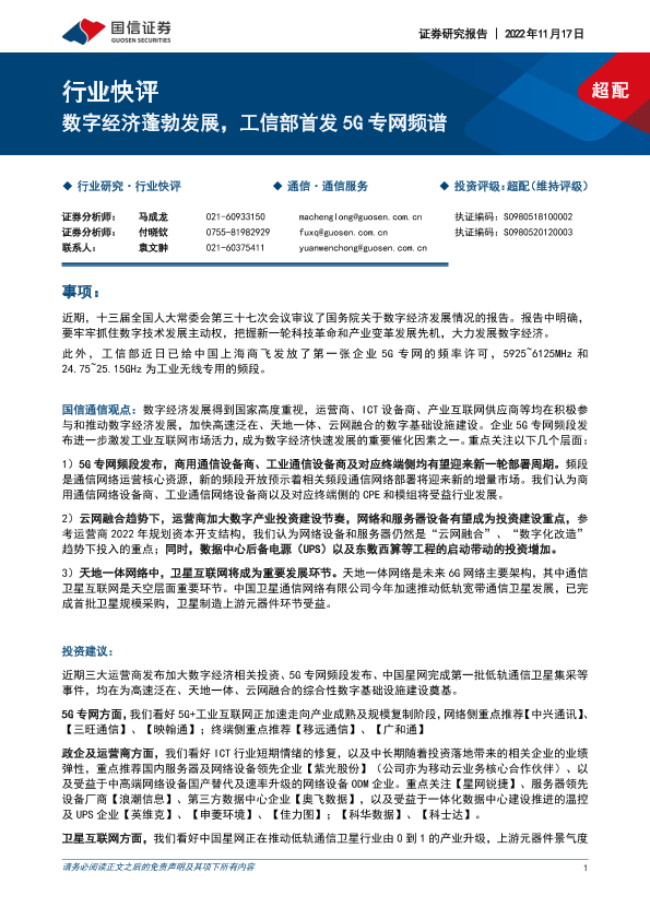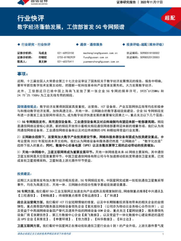 【国信证券】【20221117】通信服务行业快评:数字经济蓬勃发展,工信部首发5G专网频谱-10页