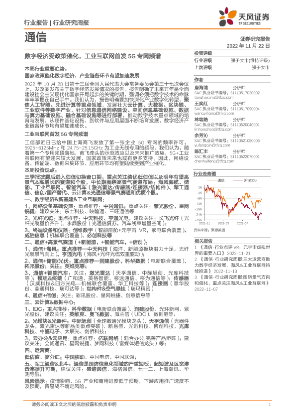 【天风证券】【20221122】通信行业研究周报:数字经济受政策催化,工业互联网首发5G专网频谱-13页