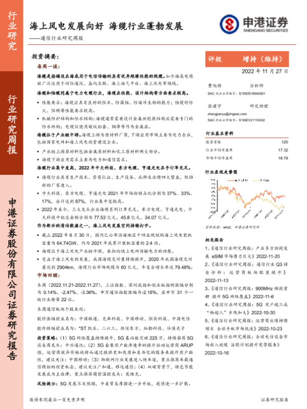 【申港证券】【20221127】通信行业研究周报:海上风电发展向好 海缆行业蓬勃发展-18页